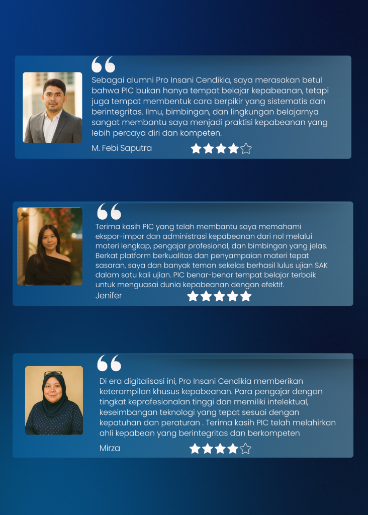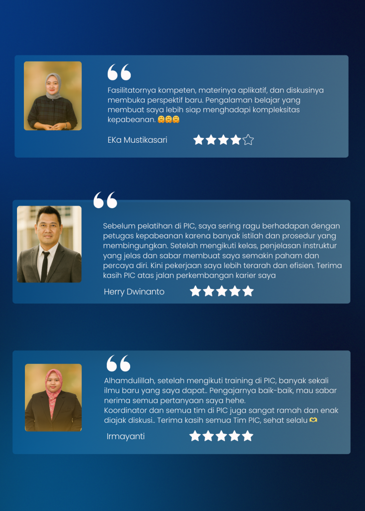 Kelas training Kepabeanan Klasikal PIC telah hadir sejak tahun 2015 dan telah melahirkan banyak Ahli Kepabeanan yang handal di Indonesia.. Buat Anda yang butuh fokus lebih dalam belajar, kelas Klasikal adalah pilihan yang tepat.